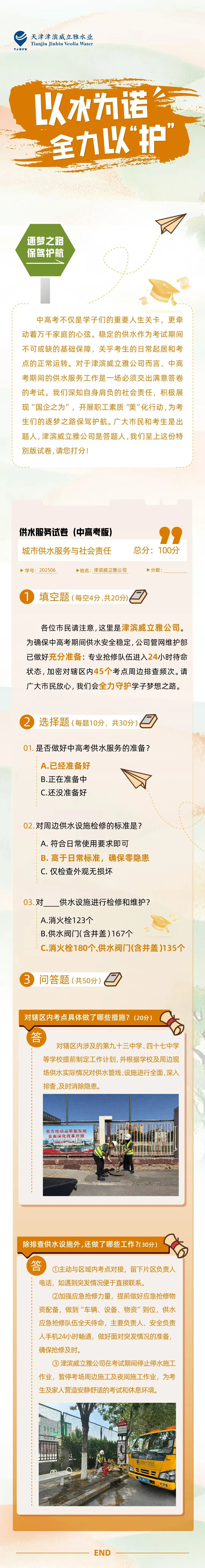 为切实保障2025年天津市高考、中考期间安全优质供水,滨海水务公司按照水务集团2025年高峰供水工作部署会议精神,提前谋划、周密部署,督促所属单位进一步提高政治站位,深研细判,通过加强设施巡检、提速响应处置、严控计划停水、规范现场施工、强化沟通协调,落实落细各项保障措施,筑牢安全供水防线,全力为滨海新区考生营造安全稳定的用水环境。精准检测,水质安全双达标。所属油田水务党员服务队联合港源水质党支部,对辖区内的两处考点——大港油田第一中学和大港同盛学校展开专项水质检测。技术人员携带专业仪器深入校园水房,重点检测余氯、浊度等关键指标,检测结果均符合国家饮用水标准。立体巡查,设施运行零隐患。所属塘沽中法、油田水务进一步加强考点周边供水管网巡查力度,将巡视频次由常规的每日1次增至每日3-4次,对供水阀门、消火栓等设施进行开阀试压、维护保养,建立“日查日报”机制,并通过压力监测系统实时掌握管网运行状态。巡视人员对考点周边供水管网进行不间断“贴身守护”,确保一旦发现管网压力波动、疑似漏水声响等情况,迅速定位处置,并实施错峰作业。多维保障,服务响应全天候。所属油田水务设立高考供水保障专班,优化供水调度方案,进一步加强应急抢修、物资、人员保障。客服热线开通“绿色通道”,24小时优先受理涉考供水诉求,以快速响应机制为考生保驾护航。所属塘沽中法结合夏季高峰供水工作安排,组建了一支由20余名技术精湛、经验丰富的专业人员构成的应急抢修队伍,实行24小时应急待命。同时,与考点学校、周边社区建立紧密沟通联络机制,确保突发供水事件发生时,能够快速响应、协同作战,以最短时间完成抢修任务,最大程度降低对考点用水的影响。“滴水不漏”护考季,供水全力保“清泉”,全力服务保障中高考的服务举措彰显公司为民服务的责任担当,也赢得了相关学校的信任和点赞。接下来,滨海水务及所属各单位将持续关注考点及周边供水情况,通过科学部署与精细化管理,持续提升供水服务质量,全力以赴保障两考期间安全、优质、足量供水,为莘莘学子顺利应考筑牢坚实后盾,交上一份满意的“安全保供水答卷”。 津滨威立雅公司