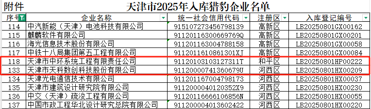 近日,天津市科学技术局发布了《2025年天津市猎豹企业入库名单公告》,天津国有资本投资运营有限公司(简称“津投资本”)所属天津数字经济产业集团有限公司(以下简称“天数集团”)旗下天津市天科数创科技股份有限公司、天津市中环系统工程有限责任公司,凭借在核心技术攻关、研发投入强度、科技成果转化等方面的突出表现,成功入选天津市首批猎豹企业名单。近年来,天数集团聚焦主责主业,以“做专软件服务、做强人工智能、做优数据运营、做精信息系统集成”为业务方向,围绕“党建、改革、业务”三条主线,着力发展新质生产力,积极培育新的经济增长点。此次两家所属企业成功入围,不仅是天数集团在打造科技创新平台建设进程中取得的又一重要进展,更充分展现了在政务数字化、人工智能、数据治理、数据安全、数字城市建设等业务领域的丰硕发展成果与强劲发展动力。下一步,天数集团将聚焦技术创新、市场竞争力提升、产业链协同等关键领域,持续加大科技创新投入力度,不断夯实壮大科技型企业的发展根基,进一步提升核心竞争力与综合实力。