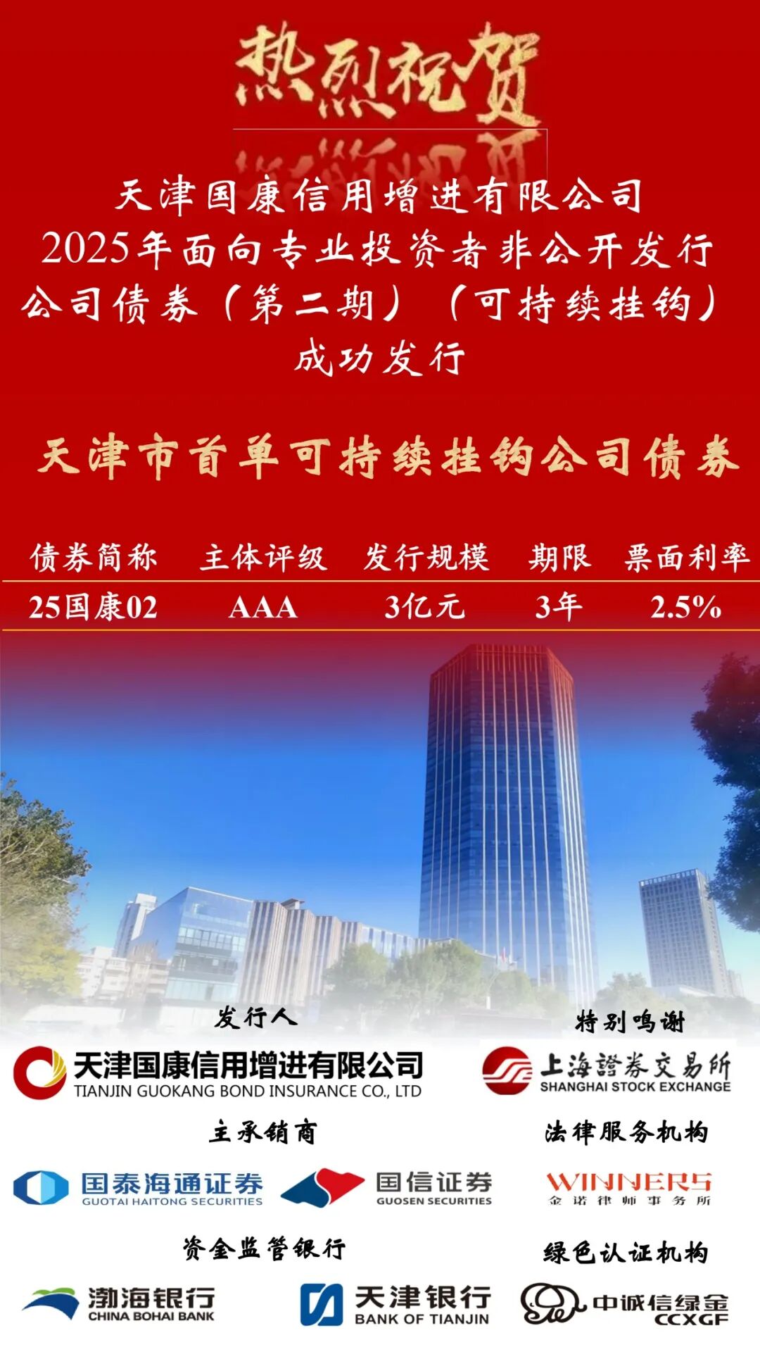 8月21日,天津国康信用增进有限公司(以下简称“国康增信”)成功发行天津市首单可持续挂钩公司债券,金额3亿元,期限3年。票面利率2.5%,融资成本再创新低。国康增信作为域内综合金融服务商,不断挖掘自身专业优势和业务禀赋,创新打造多元化金融产品。国康增信协同中诚信绿金,在此单债券中设置可持续发展指标:截至2026年末,增信、投资、保理等主业板块累计开展绿色产业领域业务规模不低于5.3亿元。债券的顺利低价发行,展现了市场投资人对发行主体和此类型债券的关注及认可。此单债券是国康增信继成功发行我市首单科技创新公司债券、华北地区首单中小微支持债券之后,围绕科技金融、绿色金融支持实体开展的又一生动实践。