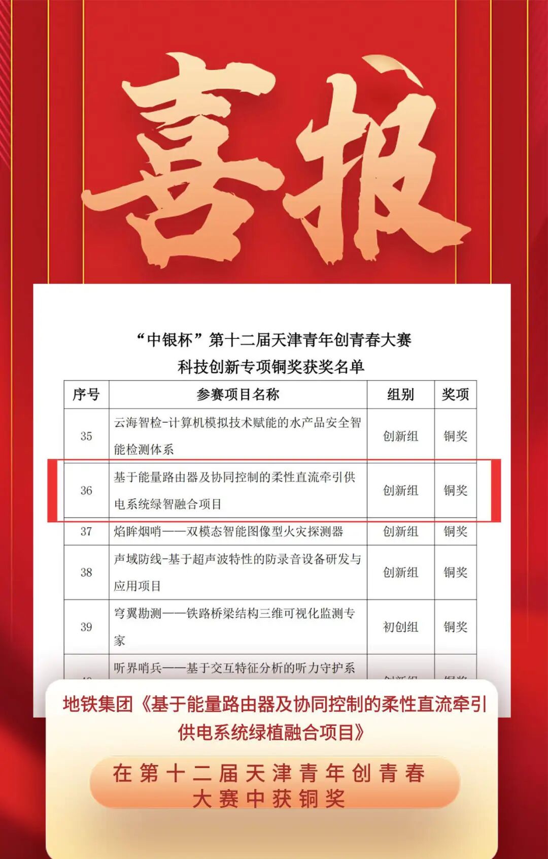 近日,天津轨道交通集团所属天津地铁集团申报的《基于能量路由器及协同控制的柔性直流牵引供电系统绿智融合》项目,在“中银杯”第十二届天津青年创青春大赛中历经初选审核、专家评审、线下路演等一系列比拼,从参赛的1000余个项目中脱颖而出,斩获铜奖。天津地铁集团积极响应国家“双碳”发展战略,以智慧、绿色、融合城轨为导向,针对传统直流牵引供电的痛点,在津静市域(郊)铁路首次开展基于能量路由器及协同控制的柔性直流牵引供电系统绿智融合项目。该项目是国内首个以能量路由器和协同控制系统为核心的柔性直流牵引供电系统。其中能量路由器及协同控制器是国内首套面向城市轨道交通、集“牵引供电、再生制动能量反馈、分布式光伏接入”三者于一体的设备,具备光伏发电、柔性用能、直流供电三大特点。相较于传统牵引系统(整流机组+能量回馈),不仅节能增效提升15%,光伏利用率≥95%,更强化了对电压和能量的实时灵活调控,进一步减少了对列车和电网的冲击、保障了设备稳定性及运营安全,实现了绿色低碳、灵活高效、安全可靠的总体目标。目前,已投入运营2个月,系统运行稳定,相比传统供电方案节能大幅提升。下一步,天津地铁集团将充分发挥轨道交通建设板块“链主”引领作用,聚焦新质生产力“五个创新”,加强与龙头企业、科研院校的交流合作,以绿色转型为主线、清洁能源为方向、节能降碳为重点,积极探索减碳路径,深化开展轨道交通空白领域新兴技术的研究与应用,奋力实现建设管理“质效”双提升,助力轨道交通集团“双轮驱动”发展。