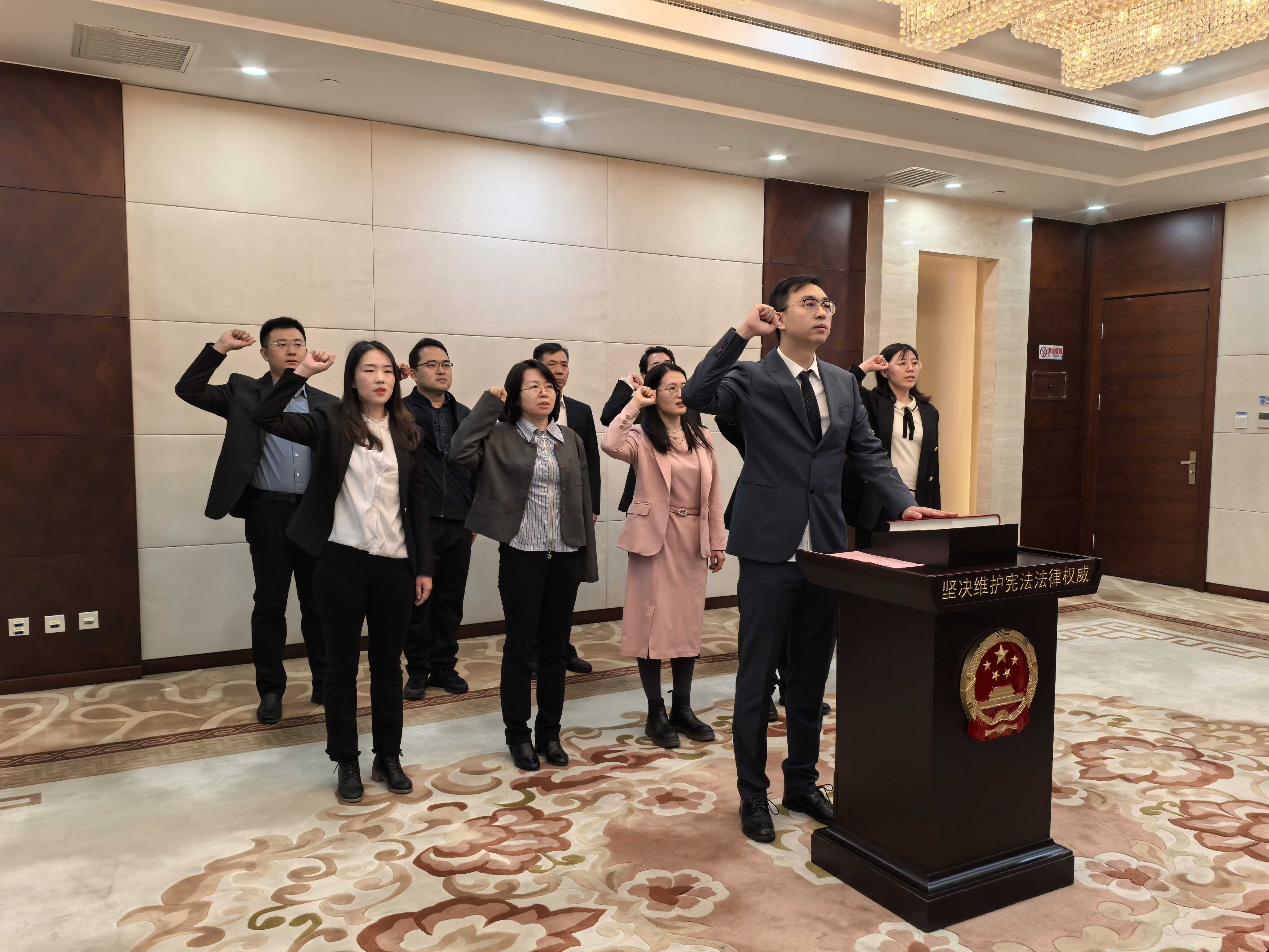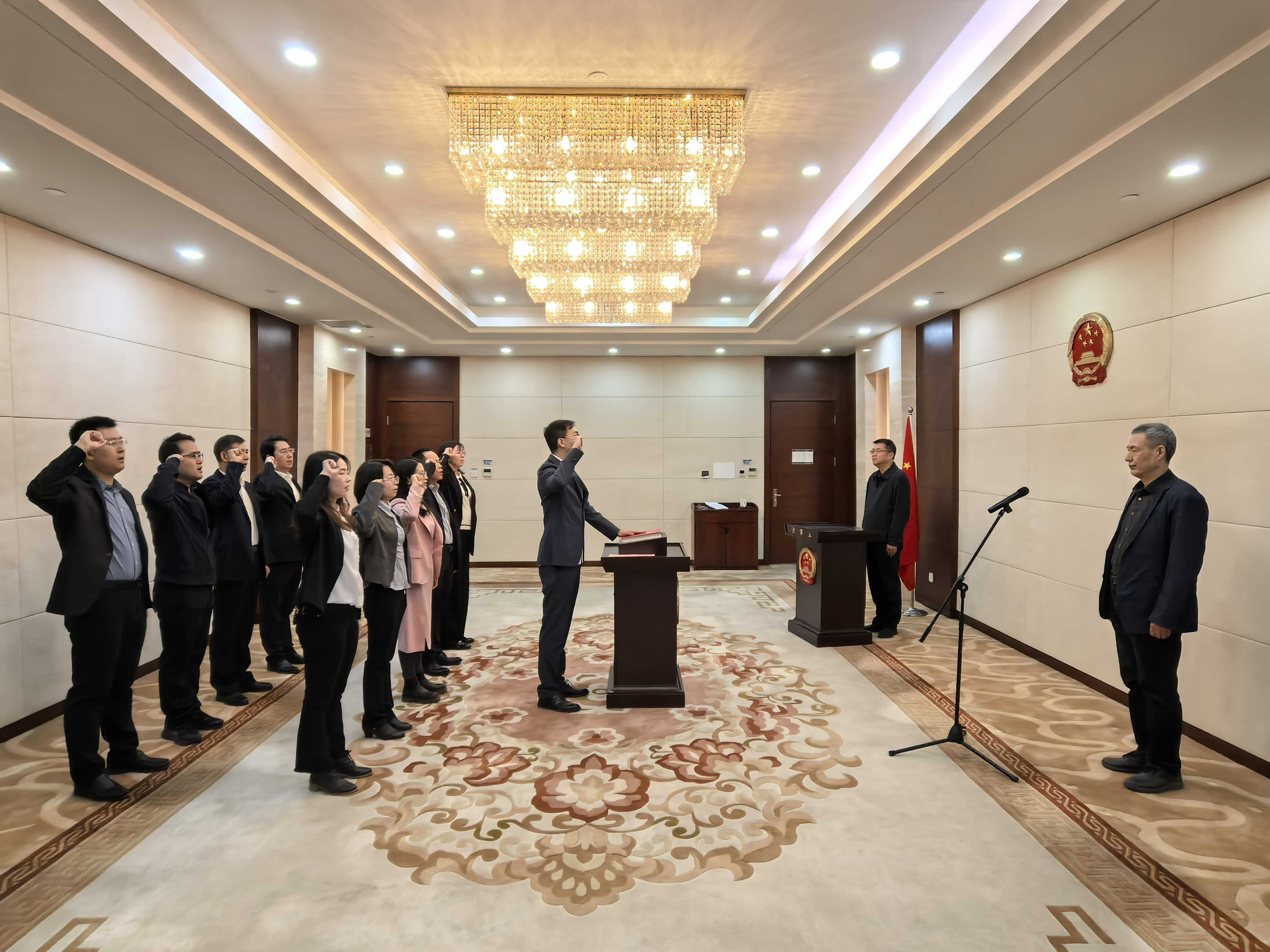 参加宣誓人员精神饱满,面向国徽,高唱国歌。领誓人手抚宪法、领诵誓词,其他宣誓人列队站立、跟诵誓词。宣誓干部纷纷表示要进一步深入学习领会习近平法治思想,带头法学法守法用法提升依法履职能力水平;要坚持以法治思维和法治方式推进国资国企改革发展,着力将法治优势转化为国资国企治理效能,推动国资国企高质量发展。
